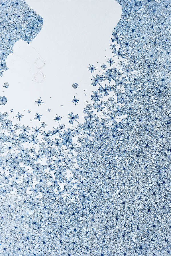 大学の卒業制作のために描いたもの。テーマは「あれも言いたくない これも言いたくない」。大学でお世話になった恩師に「日本の美術は余白の美。あなたの余白はこの青い模様よ。」と言われたことをいつも思い出す絵。制作を指導していただいているときに先生がつくっているらっしゃる品のやわらかいところを教えてもらってすごくうれしかった。メビウスのスーパーライトを吸ういぬとなかよしのひとだった。