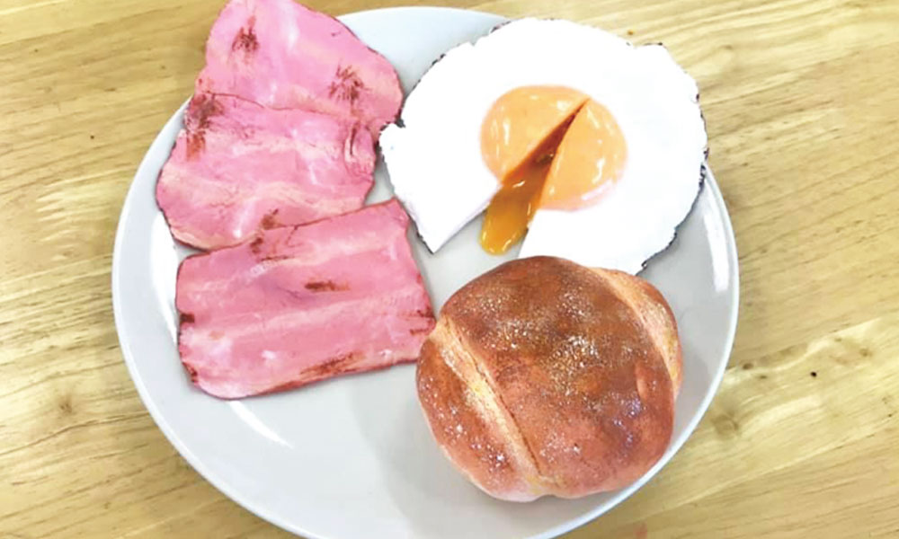 高校生向け授業の参考作品として制作。パンの小麦粉をスポンジに絵のぐをつけて表現した。たまごの黄身はボンドに少量の透明水彩を入れてつくっている。紙ねんどの授業は生徒の作品も個性的でいつもたのしかった。入れ歯をつくったギャルもリアルなするめをつくった陸上部もアボカドづくりへの執念がすごいレントゲン技師のたまごも薔薇の花束をつくったちょっとチャラい子もたのしそうだった。