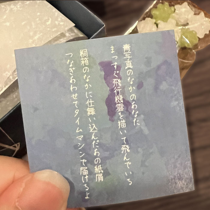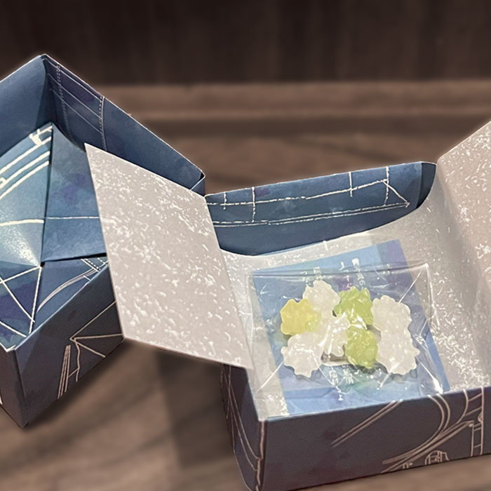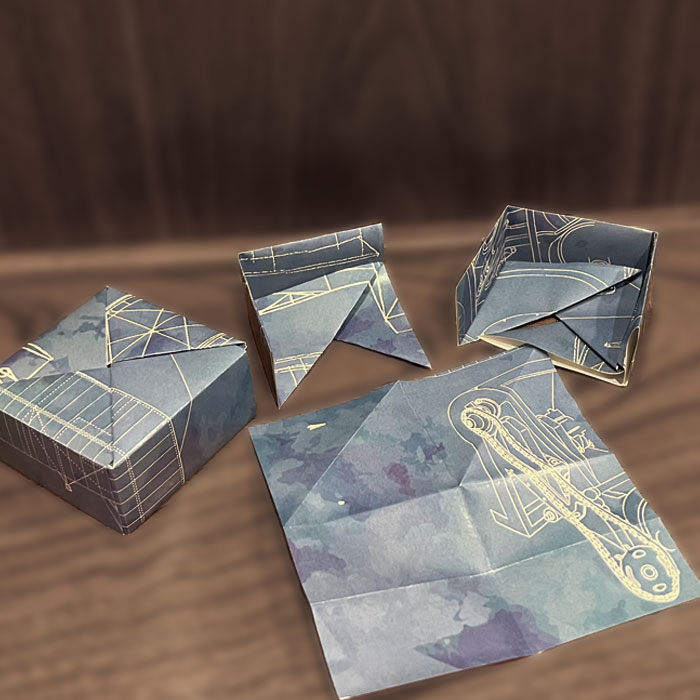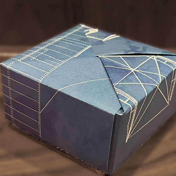 受験生を応援するこんぺいとうのパッケージデザイン。折ると祈るの字が似ていることから折り紙をモチーフにした。15cm×15cmの紙を8枚組み合わせて箱のかたちをつくった。箱の柄はひこうきの図面を青焼きしたもののイメージ。ひこうきのモデルはライトフライヤー号。