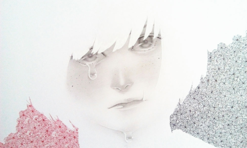 大学の卒業制作でやさぐれていたので顔のかわいい子を描こうと思い、のんびりたのしく描いた。しずくの表現、瞳の表現をする際に透明感を意識した。2Bのシャープペンシルで色の濃淡をつけて指でぼかしている。