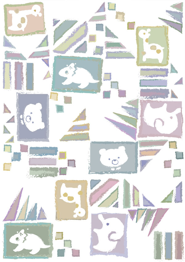 illustratorの操作の練習をするために描いた。すきなアーティストに贈るクリアファイルがほしいと思っていたため、A4サイズになることをイメージして描いている。白で抜いたゆるい絵柄のどうぶつたちや図形をたのしく描いた。