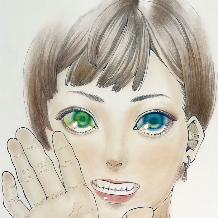 瞳やまつげをきれいに描きたいと思い、描いてみた。手や指の凹凸を表現することがたのしかった。コピックで瞳を描いたとき特有の雰囲気がすき。